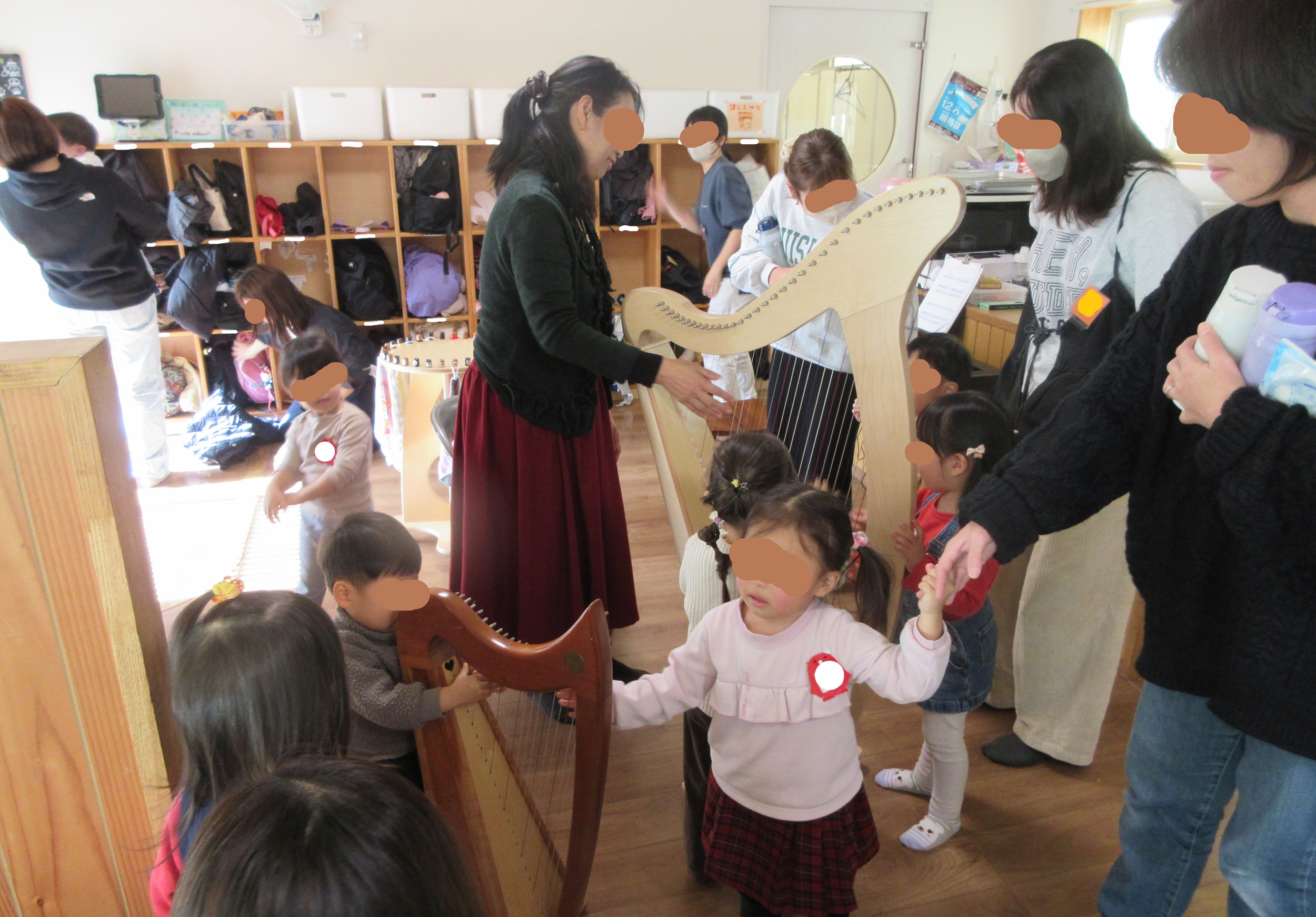 2歳児クラス「こひつじ」のクリスマス会 ハンドベルやハープでお祝いをしました。 写真は、事務室のA先生のハープです。 大きい方も小さい方もアイリッシュハープ アイルランドで発展した小型のハープの事で 温かみのある音が特徴…と言われています。…