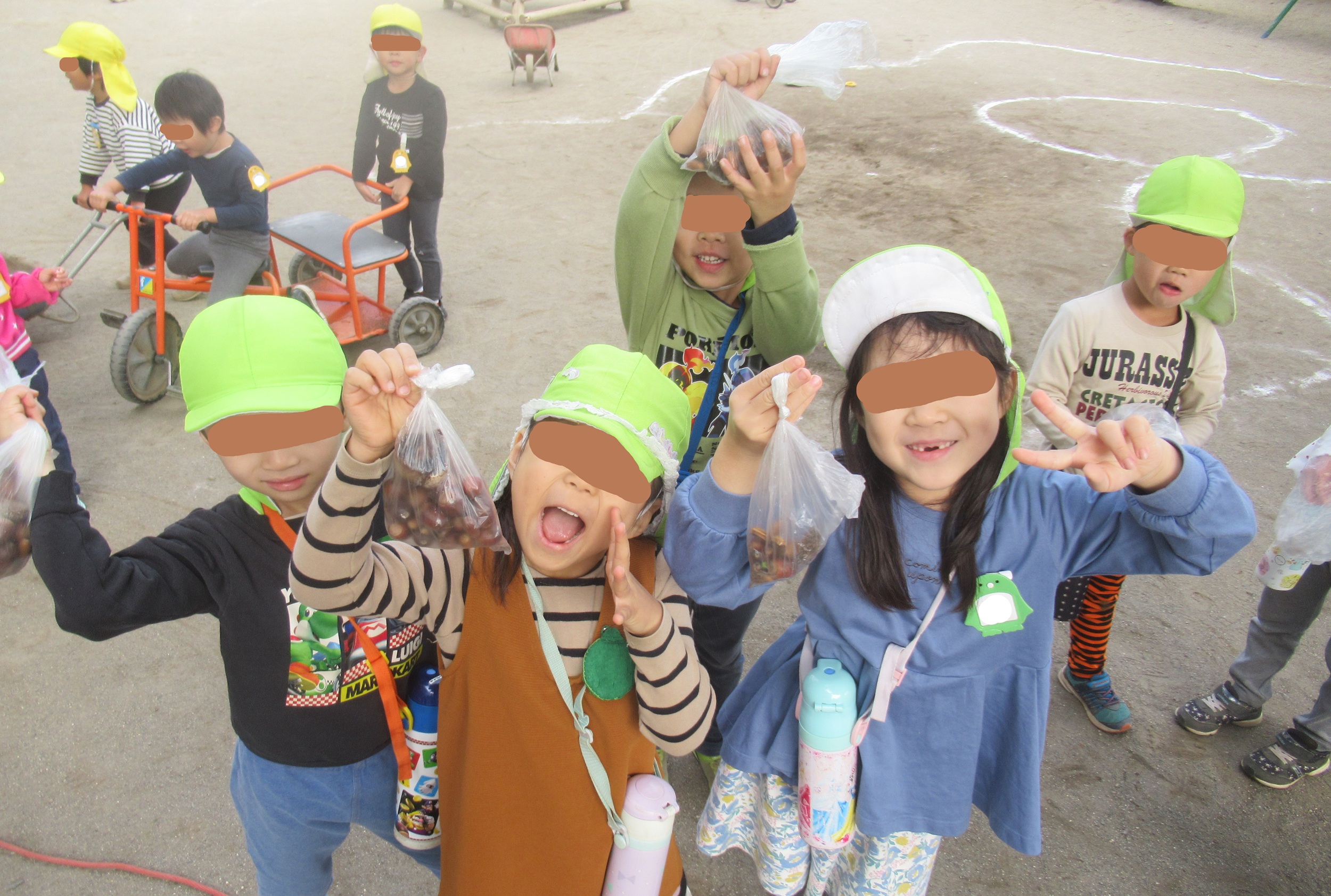 年長さんがお散歩から帰ってきました。 袋の中は『まん丸どんぐり』がいっぱい。 行先は小平市役所の隣の雑木林🌳🌳🌳 雑木林……というほどではないかもしれませんが、 どうやら『クヌギ』の木があった…