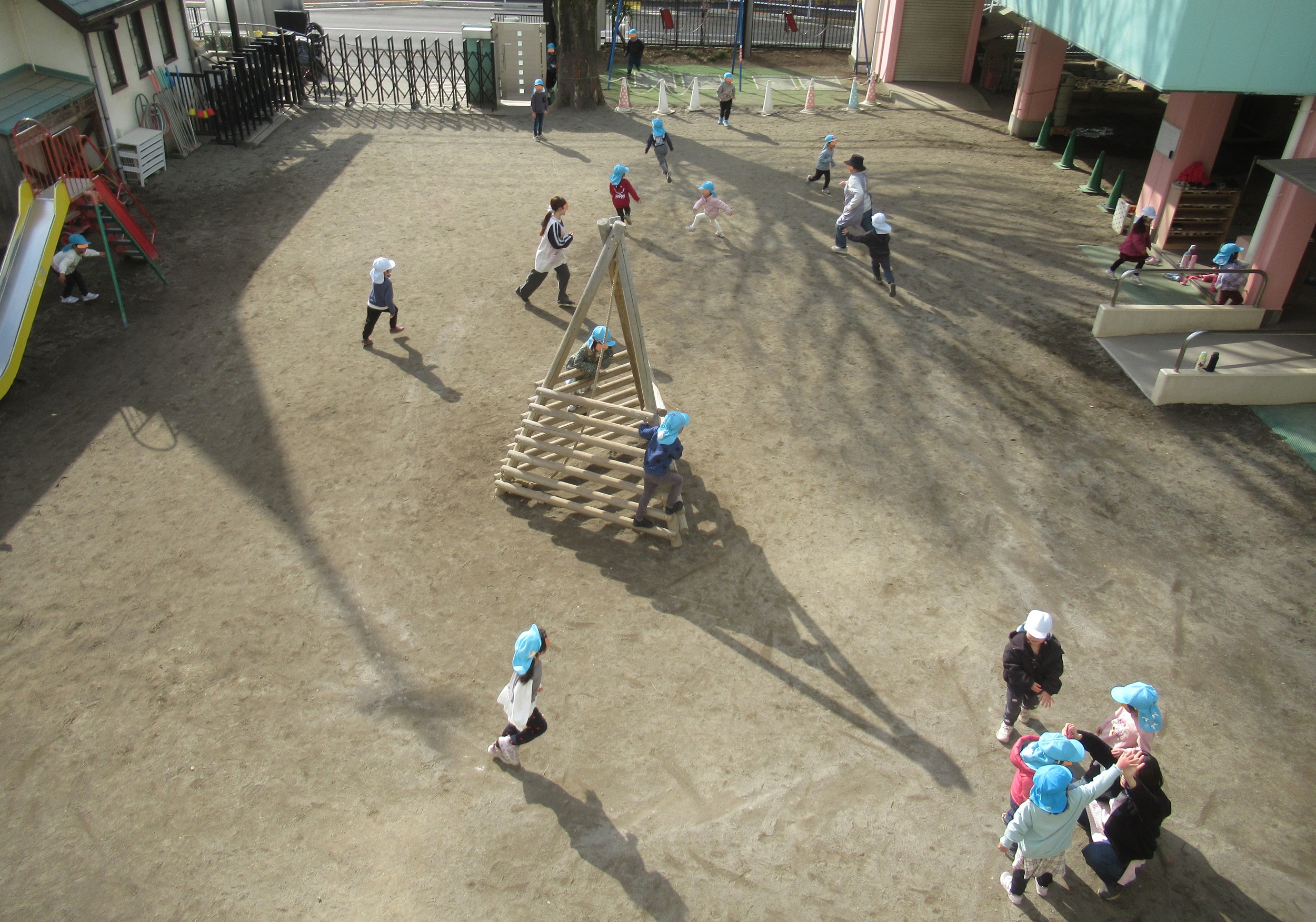 てんし組の保育参観3回目。 写真は、園庭で「バナナオニ」をしている所です。 手前のテラスで保護者の方が参観しています。 寒くてごめんなさい💦💦💦 年中さんも、この時期には集団遊びの楽しさを知り…
