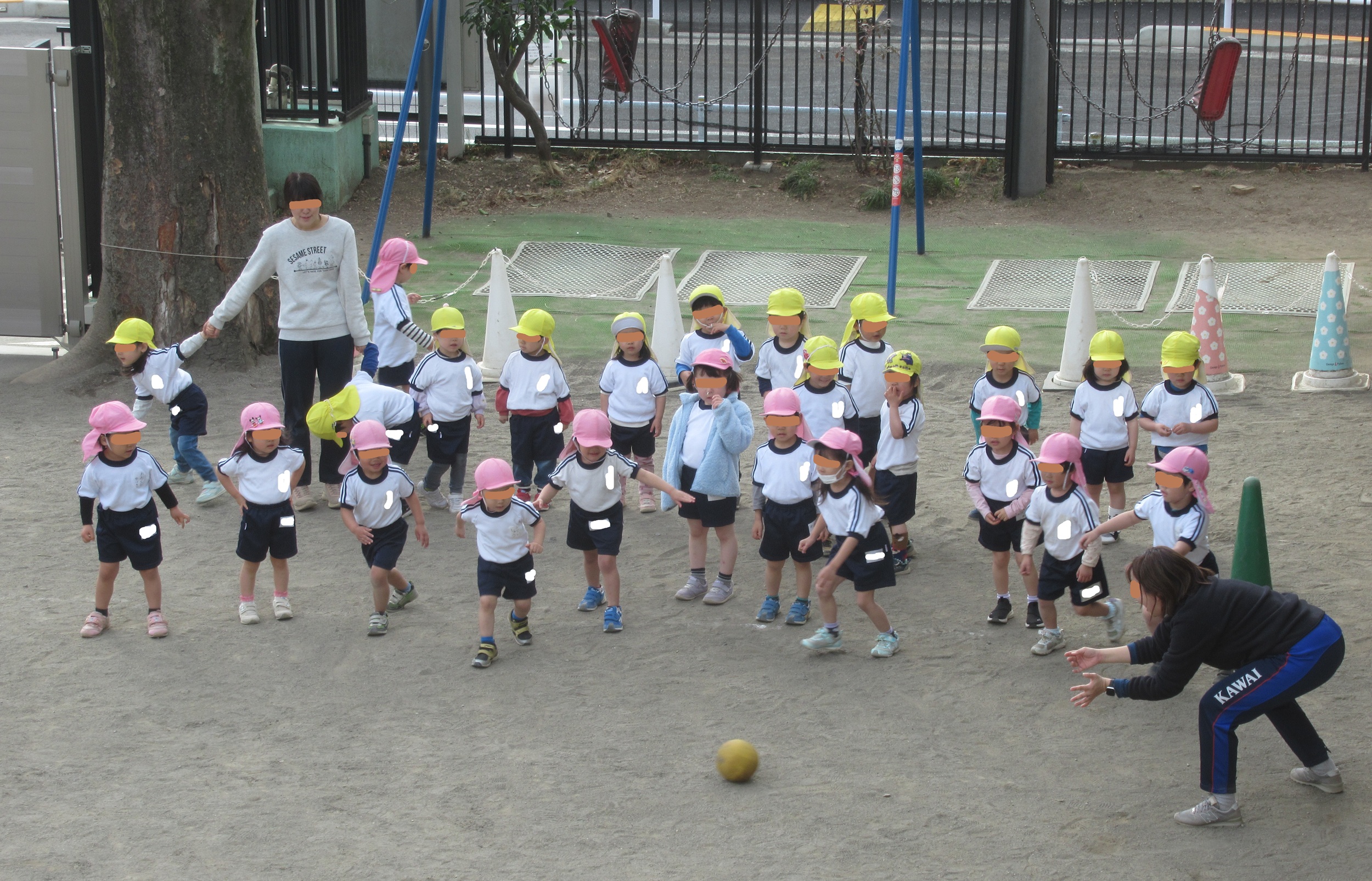年少さんの体操です。 黄色い帽子がつき組さん。 ピンクの帽子がほし組さん。 M先生が投げるボールに当たらないように 走り抜ける…というミッション(?)です。 サッカーをやっている人にとっては、 至難の業だよなぁ~……そんな事を考えながら 2…