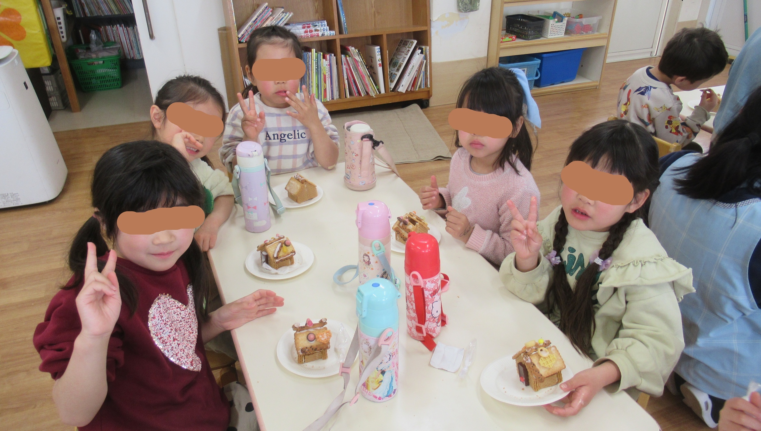今日、のぞみ組では『お菓子の家』を作りました。 学年末の、お楽しみタイム💛特別の特別です。 市販のお菓子(ウエハース、ビスケット、etc.)を アイシングを使って組み立てて、 チョコやグミで飾りつけ。 完成した家をしばし鑑賞…