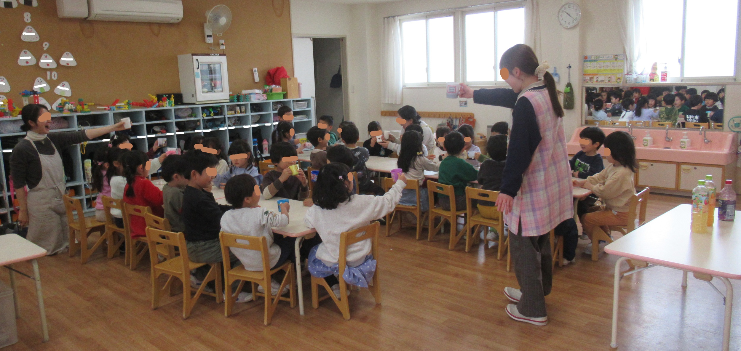 てんし組の学年末のお楽しみタイム💛は 『ジュースパーティー』 りんご・オレンジ・ぶどうの3つのお味から 好きなジュースを選んで「かんぱ~い🥂」 おかわりもあったようで、 大満足のてんし組さんでした。