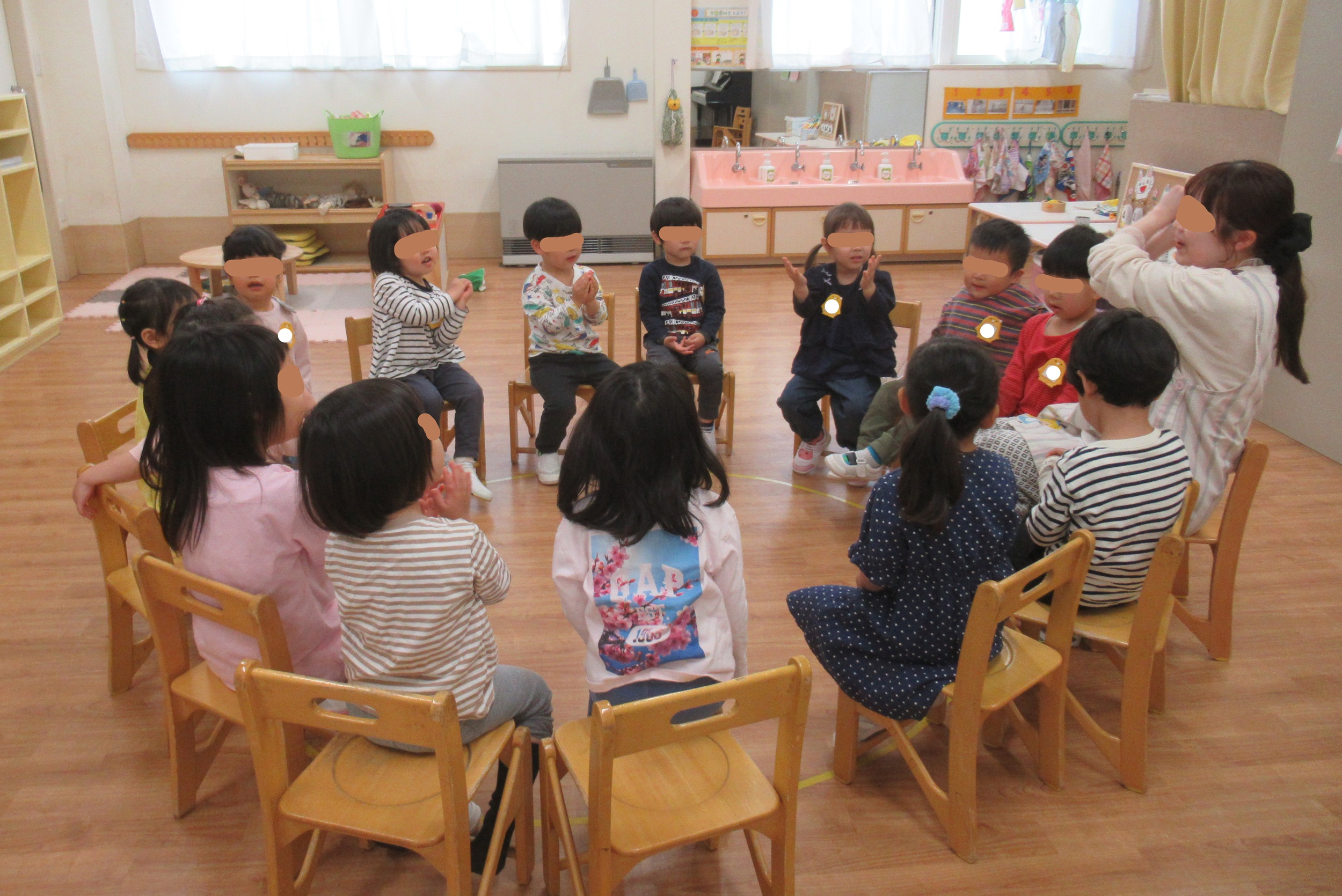 年少つき組さんの、はじめての「礼拝」 いわゆる「朝の会」です。 登園時に泣く人がいましたが、 みんな泣き止み、座っています。 担任のY先生の手遊びを楽しそうに真似する人、 無表情でジッと見ている人、 ただただ、座っている人……様々ですが、 …