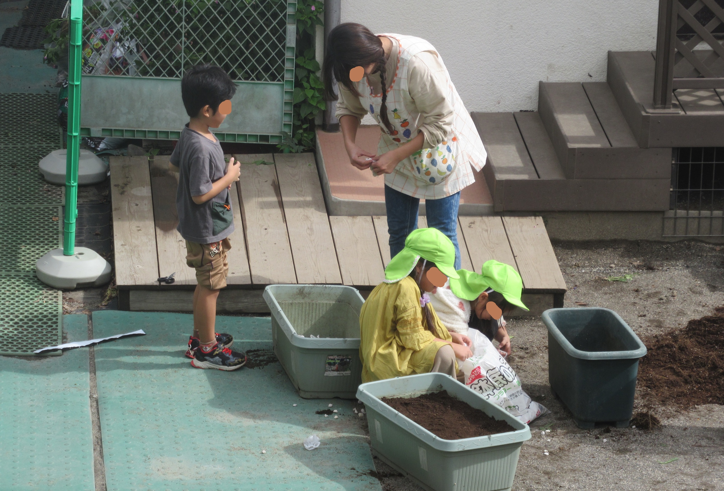 プランターの横で網袋に何かを詰めています。