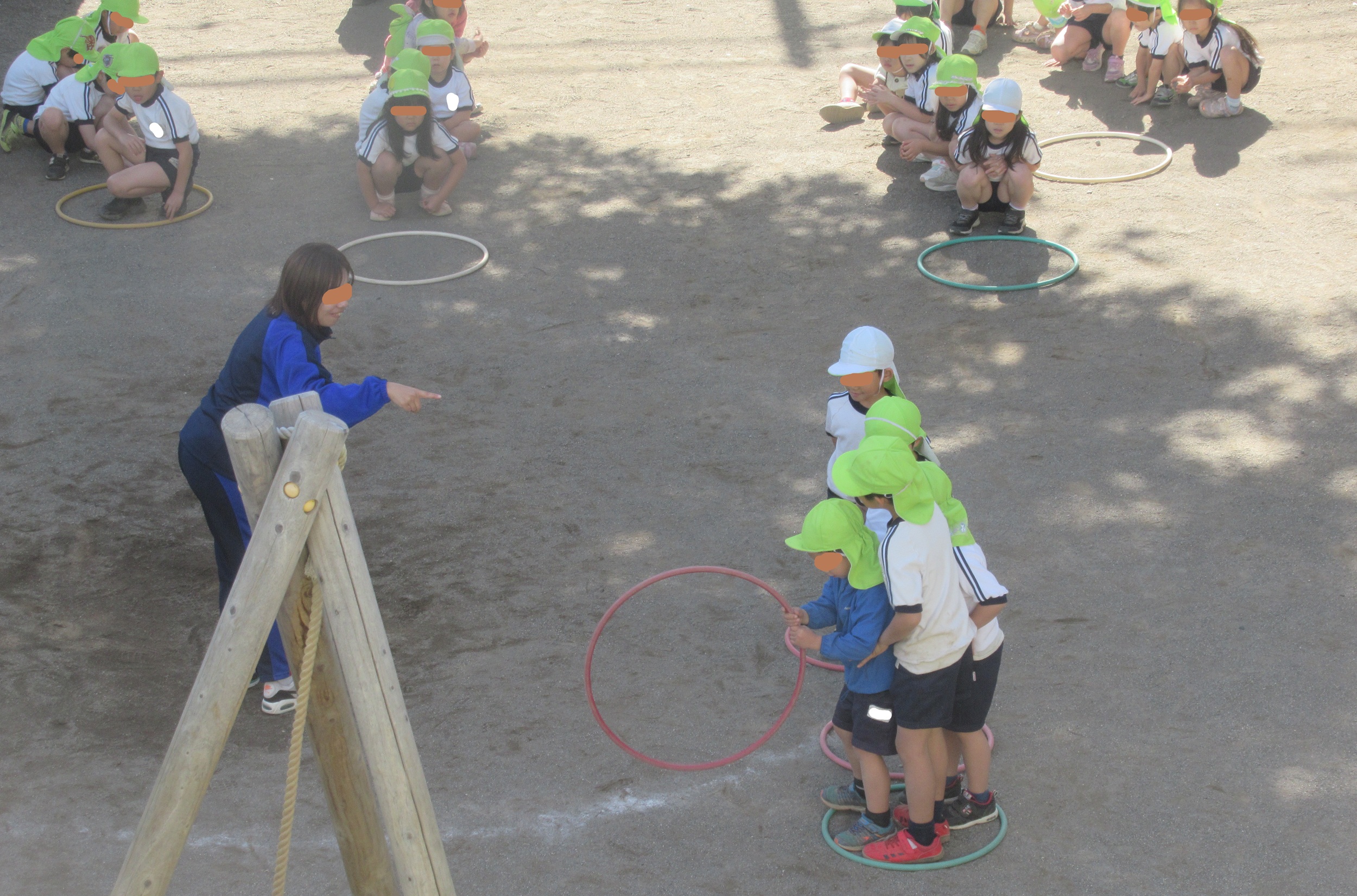 年長さんの体操の時間。 フラフープを使ったゲームです。 5人のグループに、フラフープが4つ。 みんなで前に詰めて、一番後ろのフラフープが 空いたら、それを前に移動します。 そして、また詰めて後ろのフラフープを前に。 それを繰り返して、5人で前に進みます。 芋虫がニョキニョキと前に進むように……。 う~ん、なかなか難しそうです。 5人が協力して、気持ちを一つにしないと、 前に進むことはできません。 何より、全員がルールを理解することが大事! これをチームに分かれて競争しました。 写真は、こばと組の...