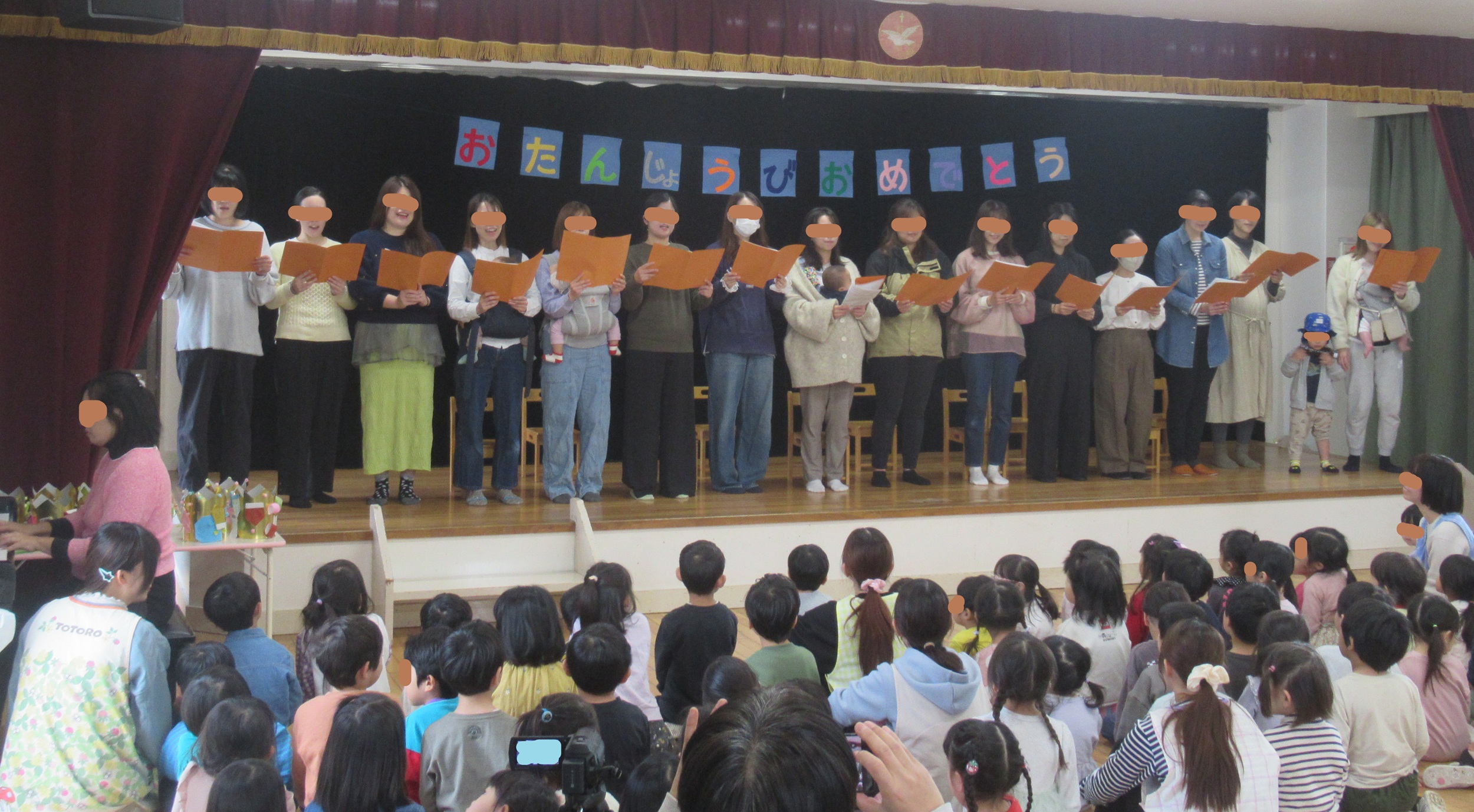 毎月恒例となったバースデイ合唱団🎵 誕生会に駆け付ける即興合唱団です。 今朝まで、楽譜を取りに来た人が4人。 4人で歌うのかぁ~? カルテットじゃん💦 (カルテットとはイタリア語で4人組の意味) 覚悟を決めながらも門で呼びかけた所…… なんと集まったお母さん達、16人❣ いつも、こうやって集まってくださるんです。 本当にありがとうございます。 しかも、振りを付けてくれとお願いすると、 笑顔でやってくださいますし、 急に「ハモって!」「輪唱して!」等と...