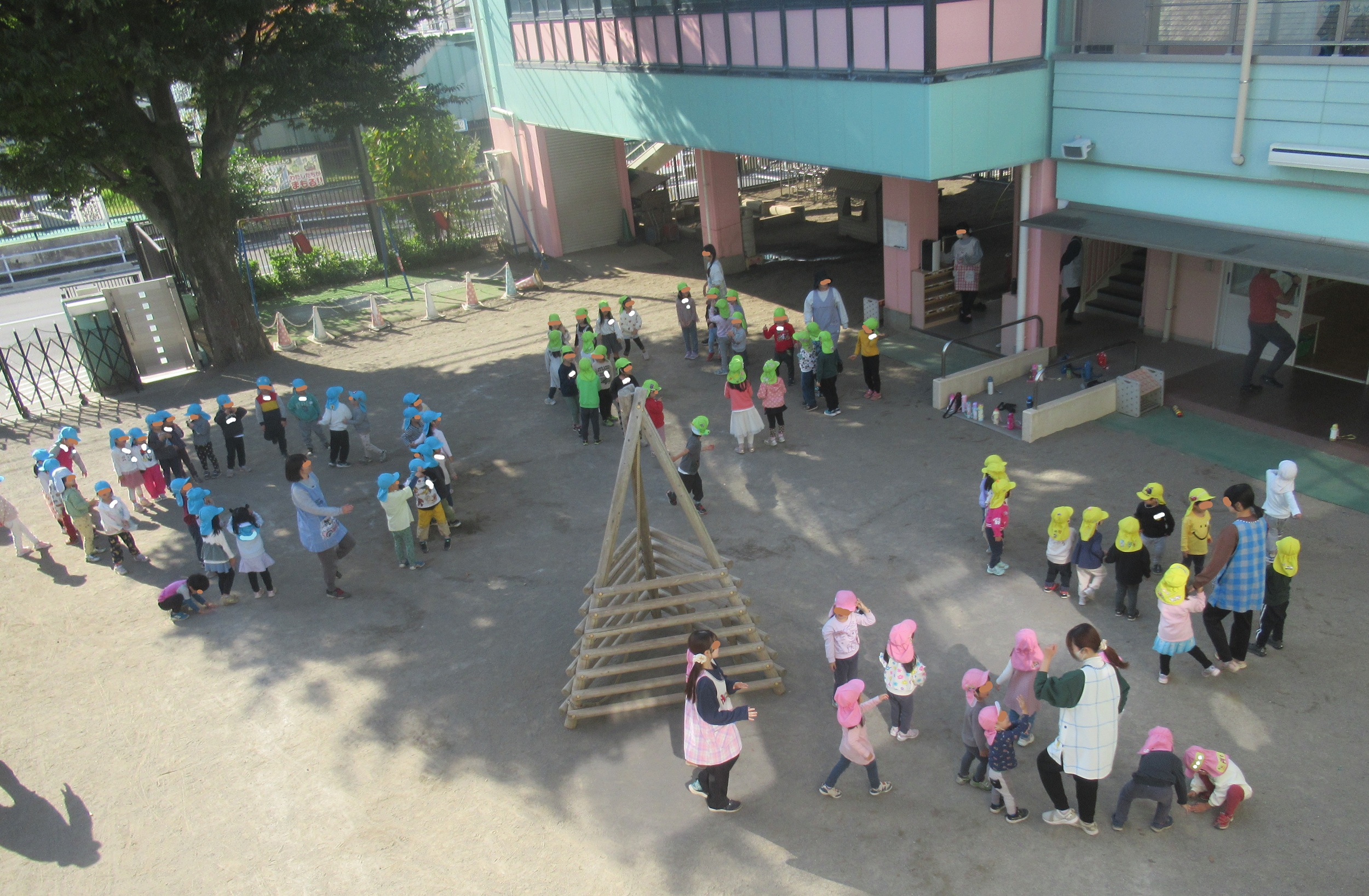 毎週火曜日は正課の『体操』です。 カワイ体操教室のM先生のリードで、 各学年30分ずつ、楽しく体を動かします。 ルールのあるゲーム&遊び&運動。 ルールを守るからこそ、楽しめる事……。 これを一人一人が体感することは大事です。 「白いスタートラインから矢印の方向に、 木製遊具をグルッと回ってゴールする!」 半年前は、絶対に出来なかった事ですが、 こうして、ちゃんと楽しめるようになりました。 年少さん、ちゃんと成長しています。(^_^)