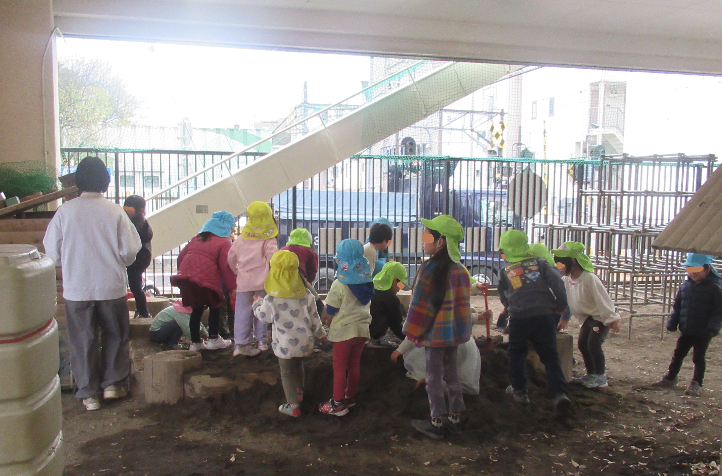 10/27に、このページでご紹介しましたが、 年長さんが夏野菜の後片づけをしたプランターに 冬野菜の種を撒きました。 プランターの横の土の袋からも、芽が出てきます。 さぁ、何の種を撒いたのでしょう? 答えは・・・・・・・・・ プランターは、ほうれん草。 土の袋は、大根です。 そう言われれば、それっぽい葉っぱですよね!? どちらも、子葉(しよう)は雑草のようでしたが、 そのあとに出てきた本葉をよく見ると、 まぎれもなく、大根とほうれん草です。 果たして大根は、この袋の中に実るのか……? ほうれん草...