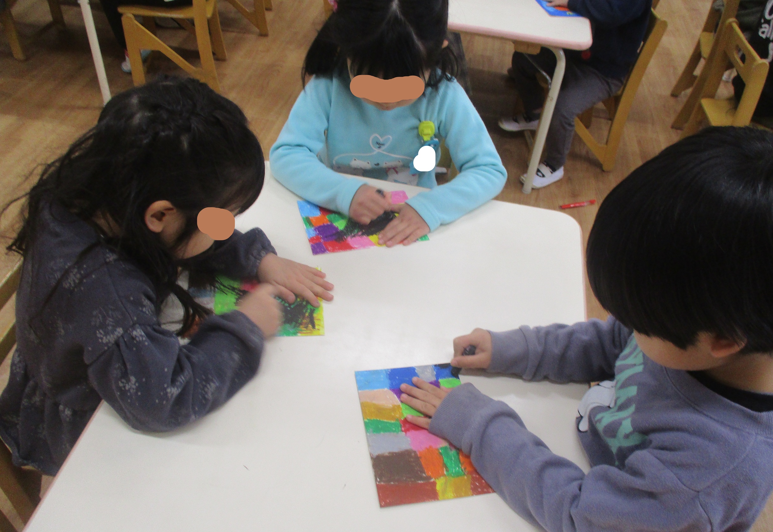 年中てんし組さんを覗くと、 画用紙をカラフルに塗りつぶした上から 黒いクレヨンを塗っています。 せっかく綺麗な色に塗ったのにぃ~? 『ひっかき絵(スクラッチ)』に挑戦です。 真っ黒に塗り潰した上から、先の尖った割りばしで ひっかいて絵を描くと……きれいな色が出るのです。 でも、ひっかくまでのこの過程が大変💦 根気のいる活動です。 課題は筆圧! 濃く塗らないといけません。 クレヨンを握る手が痛くなるんだよね。 キコキコと小刻みに動かして、 気が付けば、手が真っ黒け❣ ...