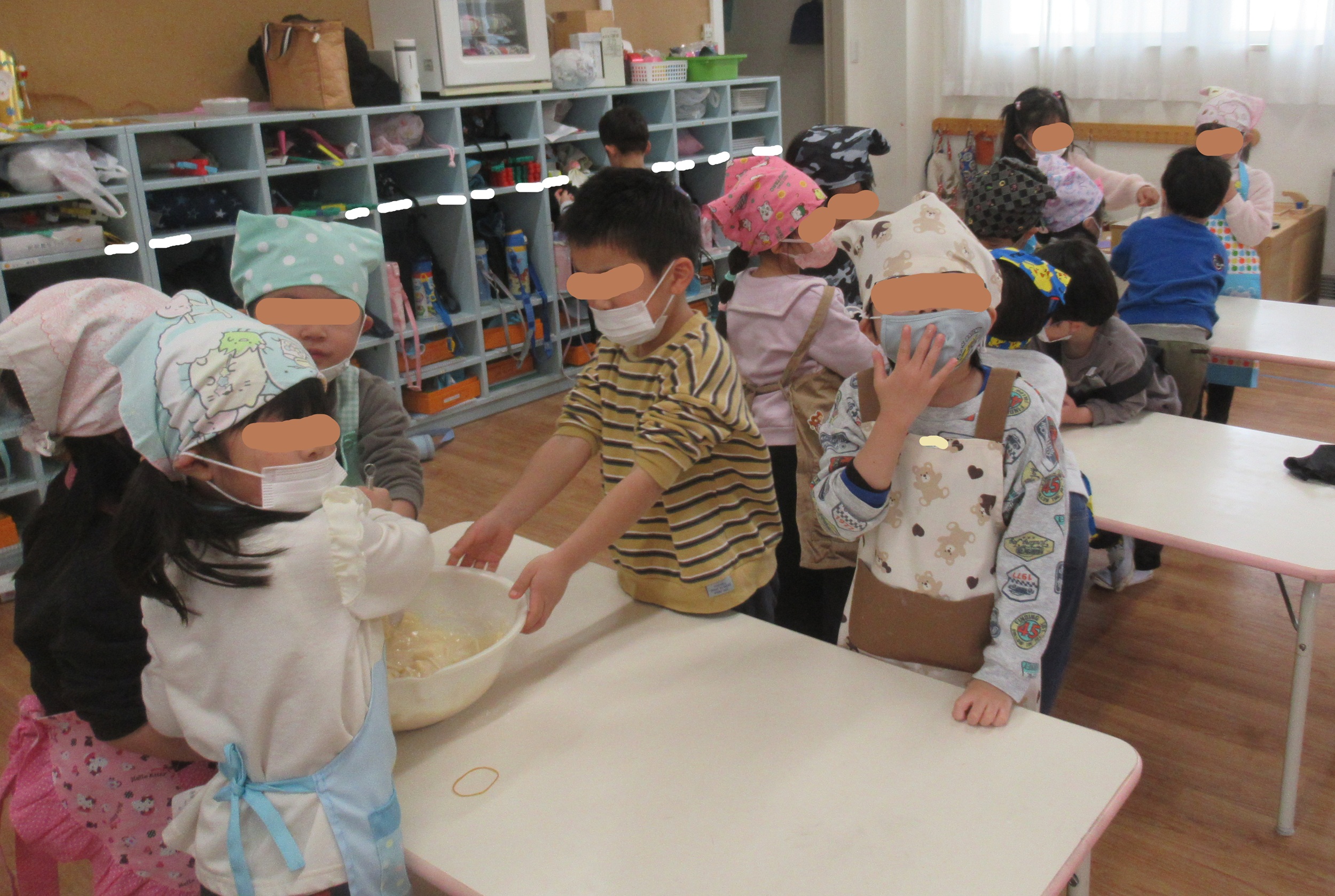 明日は誕生会🎂てんし組でケーキを作りました。 エプロン姿が可愛くて、ニンマリしてしまいます。 今回は、リンゴのケーキ。 「おいしくな~れ! おいしくな~れ!」 と唱えながら、みんなで順番に混ぜています。 本当は混ぜすぎないほうが、膨らむんだけどね💦 でも、そこは子ども達のやる気が優先❣ ふんわりしていなくても良しとしましょう。 職員室のオーブンで焼いていると、ケーキの香りに 釣られて、たくさんの子どもが覗きに来ます。 「いい匂い~💛」...
