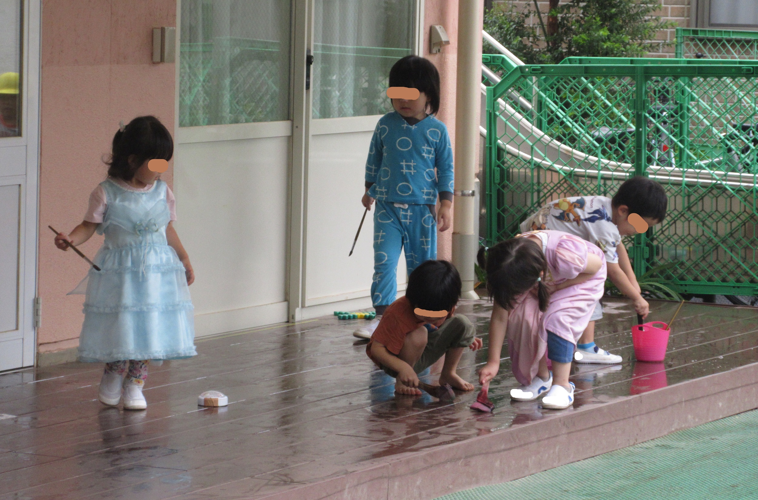 先週の水曜日、10/1の出来事です。 たしか、雨上がりの一日だったと思います。 筆を手に楽しそうに、そして豪快に、 テラスに何か描いています。 え? なに描いてるの? ちょっとちょっと~💦 近くに行ってみると、何と画材は『水』。 なるほど、テラスに降り込んで溜まった雨水を 筆に付けて、描いているのでした。 そして、キャンパスはテラス。 幼稚園のテラスは、木製のように見えますが、 実は、木ではありません。(^^♪ 木製に見える、丈夫な素材で出来ています。 だから、水で腐ることはあ...