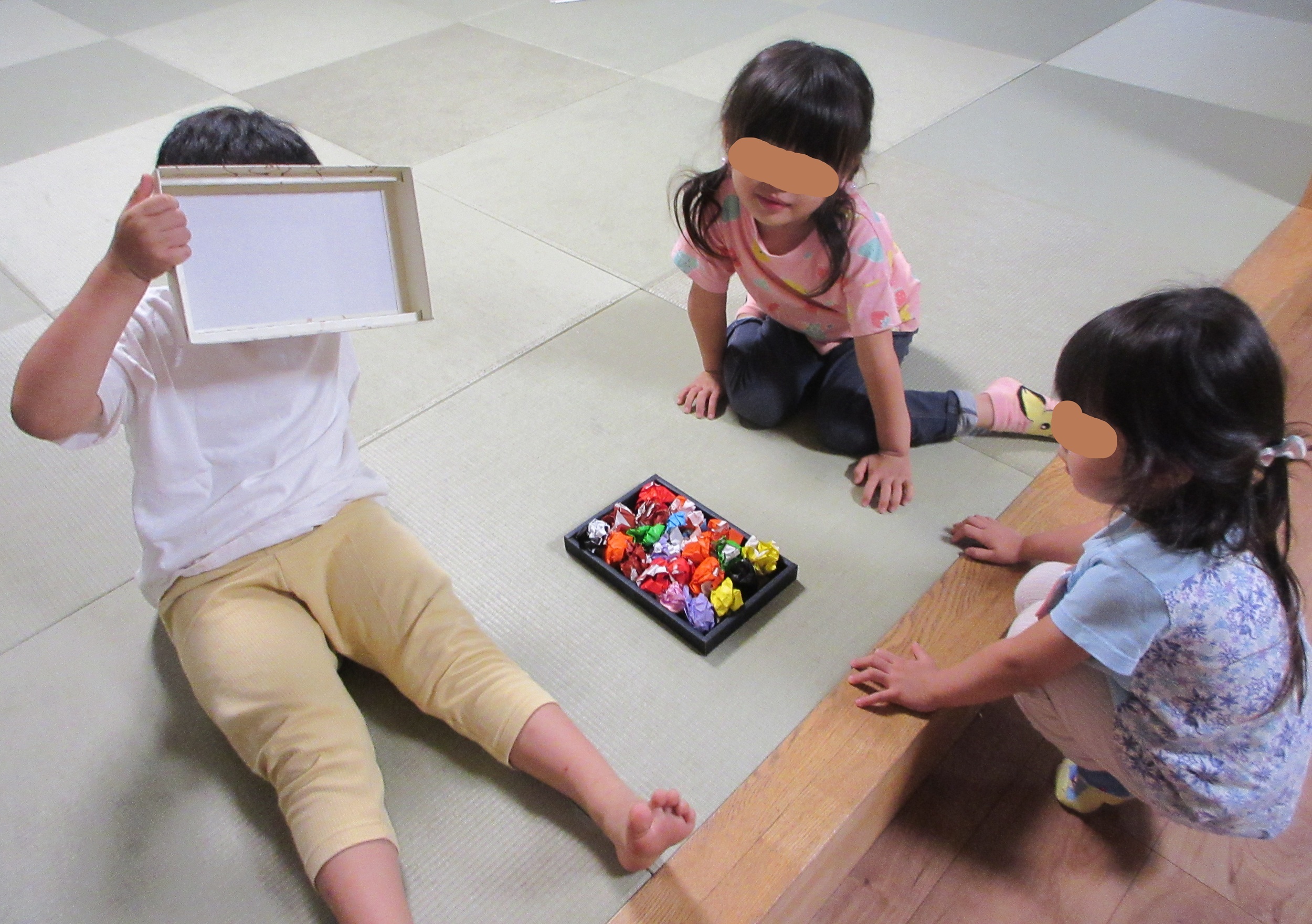 今日は運動会のリハーサルだったのですが、 先生たちは誰一人、写真を撮れず……💦 リハーサルの様子をお伝えすることができません。 そこで夕方、こばと組を覗きに行きました。 カラフルな折り紙を丸めて詰めた箱…… 中身は『アメ』だそうです。 作ったのは、のぞみ組のO君。 「美味しそうだね~。これがオレンジでしょ? これはぶどうかな? 赤いのはイチゴで、 水色はソーダ? 黄色はレモンで、茶色がチョコ! それで、この黒いのは『のど黒飴』かぁ?」 と言ったら、O君はキョトン顔・・・。 「『の...