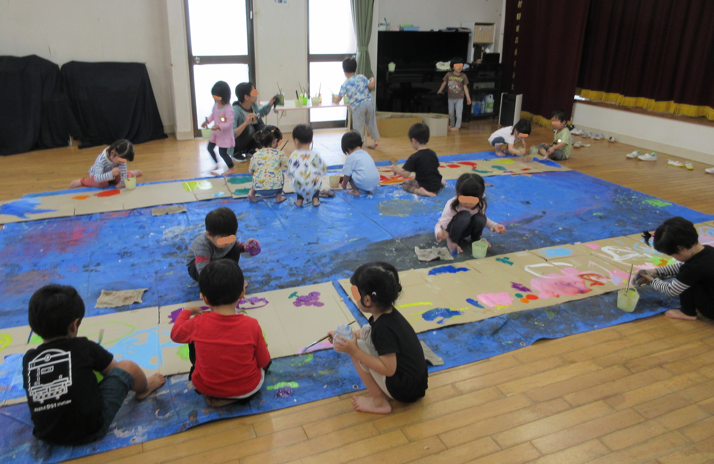 つき組さんとほし組さんの、絵の具の活動です。 絵の具用のブルーシートの上に置かれた段ボール。 運動会の年少さんのプログラムに使う 『あるもの』に色を塗っています。 私たちの運動会は、運動要素だけでなく こうした造形も大切にしています。 当日だけでなく、本番を迎えるまでの プロセスも大事ですからね。 イメージを共有して表現活動に参加できるように 日々の生活をコツコツと重ねていきます。 さぁ、この段ボール。何になると思いますか? 「これかぁ~💛」とほっこり幸せな気持ちに なっていただ...