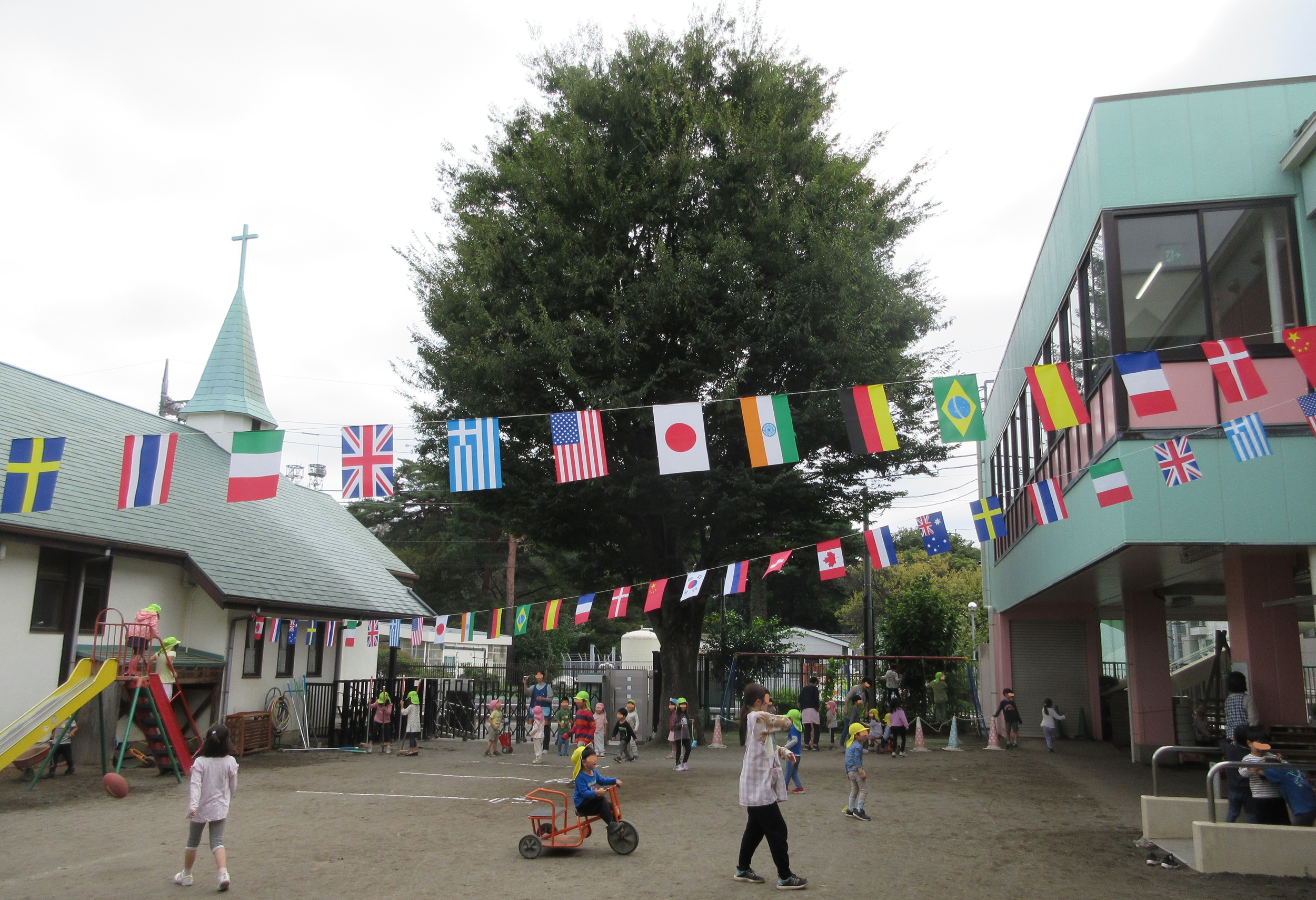 土曜日、小雨が降る中の運動会。 様々なドラマがあり、子ども達の成長を 目の当たりにした一日でした。 3日間の休みの後の登園日、 運動会の余韻を楽しんでいただきたく、 旗を片付けずに残しておきました。 園庭にラインを引いて、飛行機を飛ばす人。 三輪車に乗る人、ブランコを楽しむ人、 滑り台をする人。様々ですが、 門の前で竹馬に挑戦する人がいます。 ***************** 実は運動会の年長さんのプログラムで Mちゃん&Kちゃんが竹馬を披露しました。 Mちゃんは自由自在に……とはいきませんが...